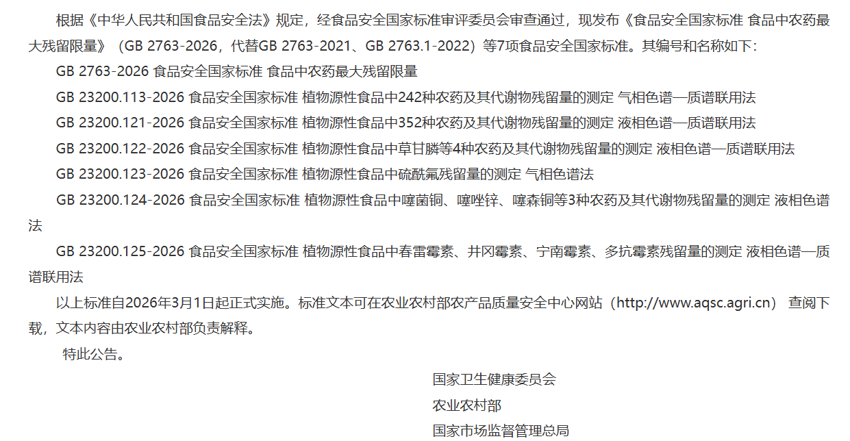 日前,国度卫生健康委员会、农业农村部和国度市场监视办理总局结合发布了《食物平安国度尺度 食物中农药最大残留限量》等7项食物平安国度尺度。该系列尺度自2026年3月1日起正式实施。